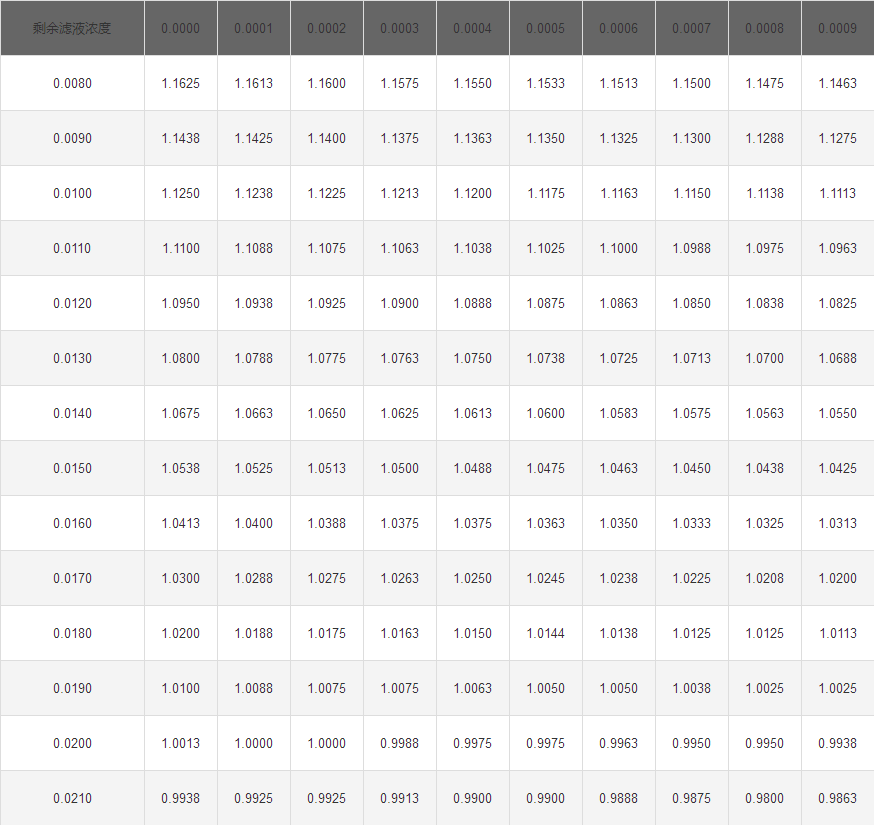 D—校正因子(通过剩余滤液浓度c从表1中查到);