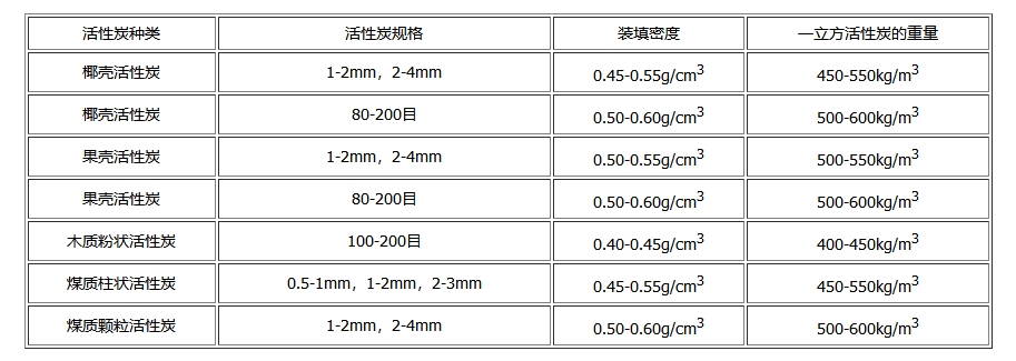 下表是竹之韵活性炭厂家根据产品的实际情况,为大家总结几种不同类型活性炭产品的装填密度,以及不同规格、种类活性炭一立方的重量,希望对大家有所帮助。